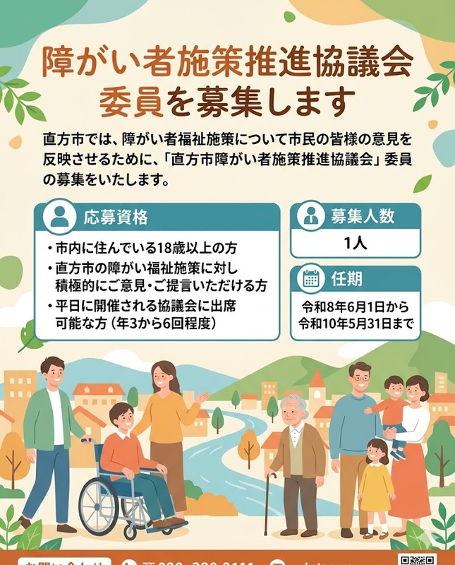 直方市では、障がい者福祉施策について市民の皆様の意見を反映させるために、「直方市障がい者施策推進協議会」委員の募集をいたします。