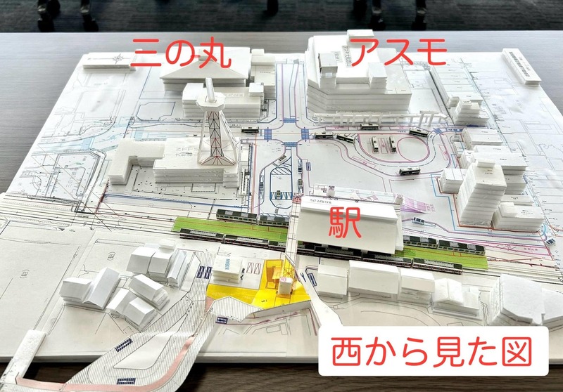 スケジュールは2028年にアスモが市営駐車場をふくむ複合施設オープン、30年に新駅完成、32年に駅前広場、駐車場完成でグランドオープン予定です。