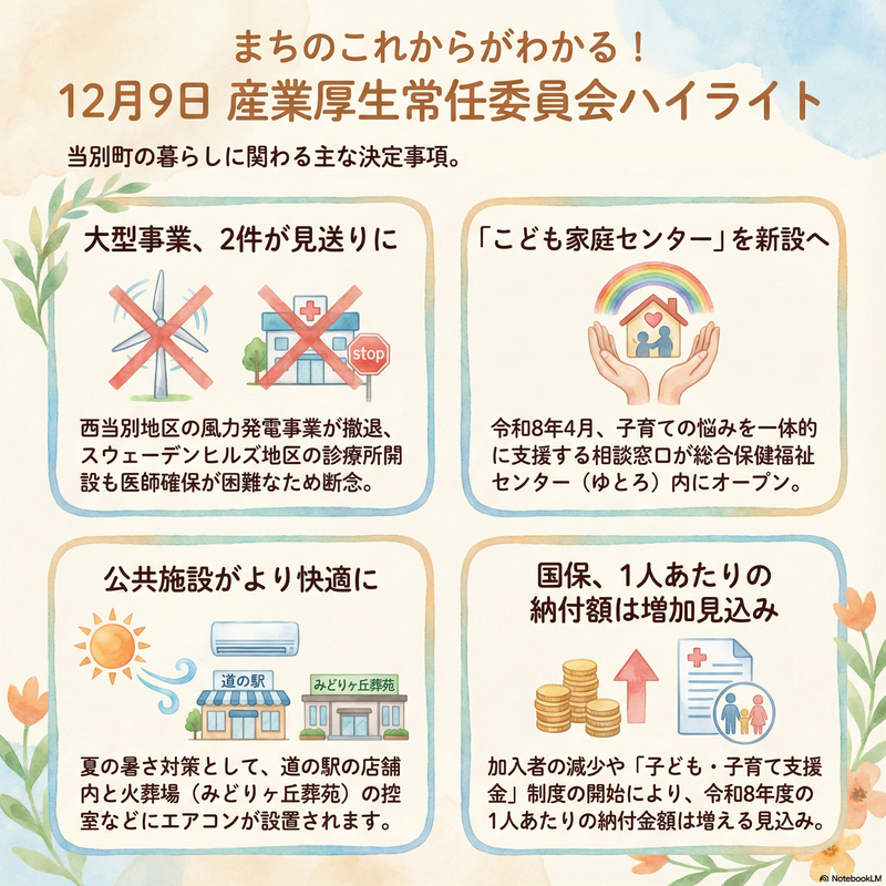 12月9日の産業厚生常任委員会のまとめはこちら。主な内容は、スウェーデンヒルズ地区への診療所開設の断念、西当別地区の風力発電事業からの撤退、「こども家庭センター」の設置、そして道の駅の空調改修など。