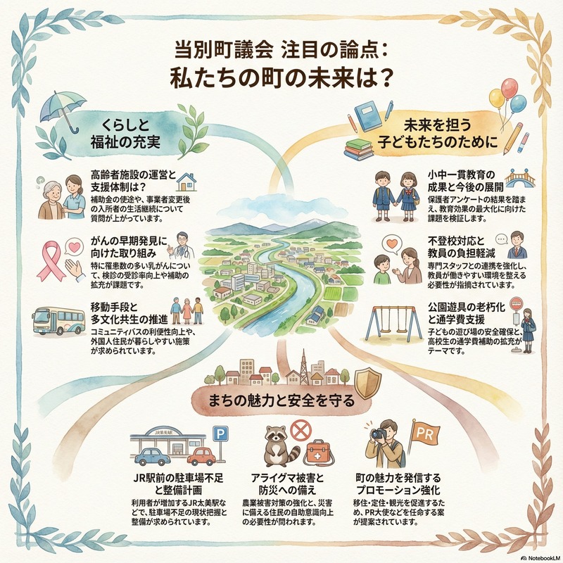 ホーム>政党・政治家>佐藤 たつ (サトウ タツ)>ついでに当別町議会の一般質問の質問通告をnotebookLMでスライドにしてみました。