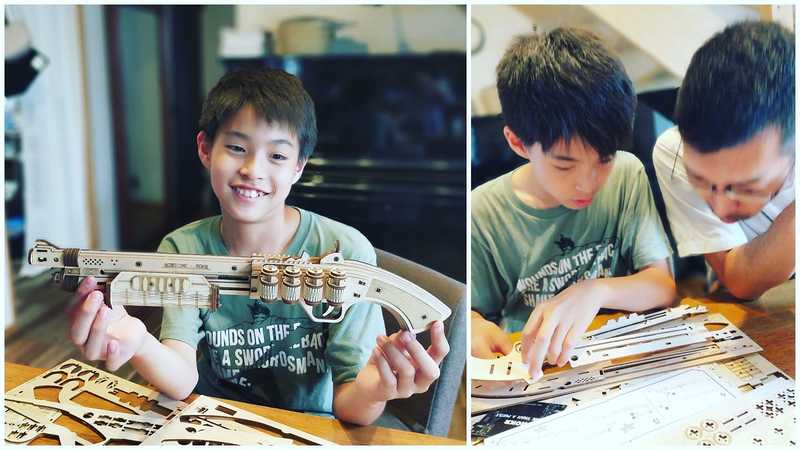 最近、割り箸で輪ゴム鉄砲を作ることにハマってる息子に、本格的な木工キットを注文してみた☆ 連射できるし、なによりカッコイイ♪