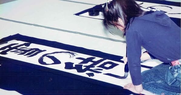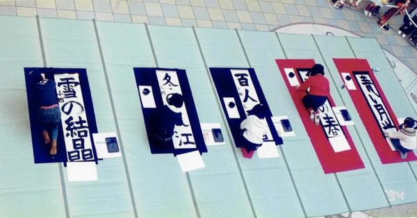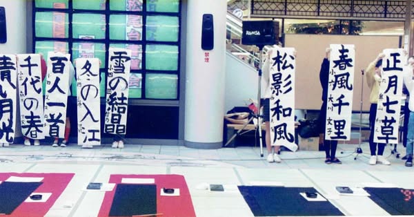 この写真は、1994年(平成6年)1月9日に同タウン内の日生中央サピエで開催された「松尾台書道会 新春特別演技」において、小学生が席上揮毫を披露した際のものです。