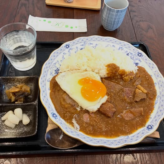 友人はワンプレートランチを、私は佐賀牛の焼肉が入ったカレーライスに目玉焼きを添えて注文しました。 スプーンは木製で、口当たりがやわらかく、ひと口ごとに焼肉の香りがふわりと立ち上がる、まさに“肉を食べるカレー”。 佐賀牛ならではの旨みがしっかりと感じられ、満足感のある一皿でした。