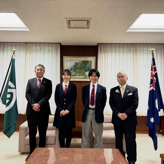 4/27 猪名川町と姉妹都市交流を続けるオーストラリア・バララット市へ3月中旬から派遣されていた高校生2人、森ひとみさんと宇治川恵翔(けいと)さんの帰国報告会を、町役場で行いました。