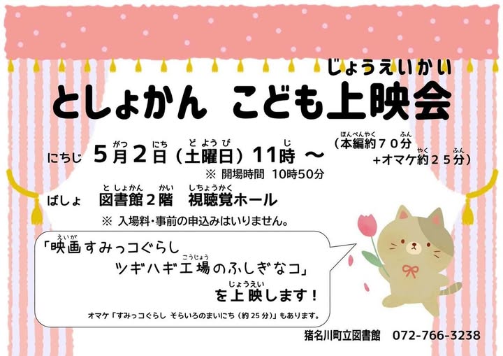 猪名川町の中央公民館で、子どもたちに大人気の 「すみっコぐらし」映画2本 を上映します。