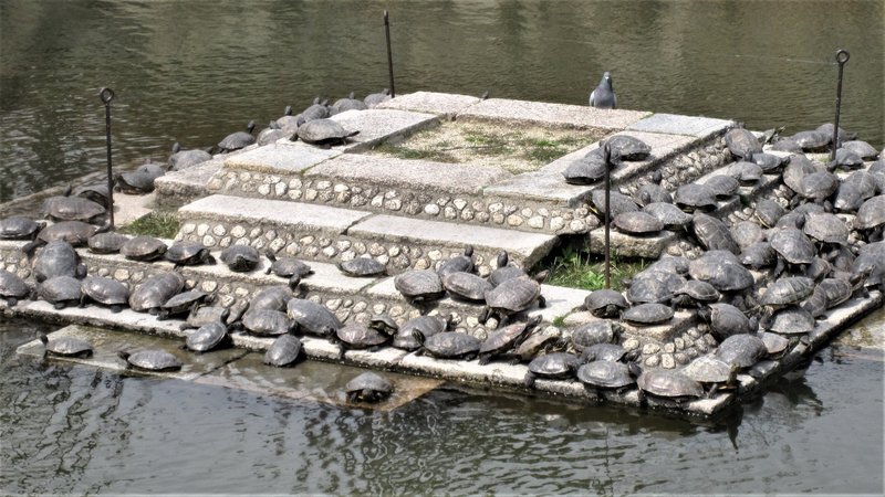 ホーム>政党・政治家>岡本 のぶじ (オカモト ノブジ)>【日本仏法最初の官寺・四天王寺参拝】四天王寺の六時堂の前の池で、沢山の亀が日向ぼっこしている。