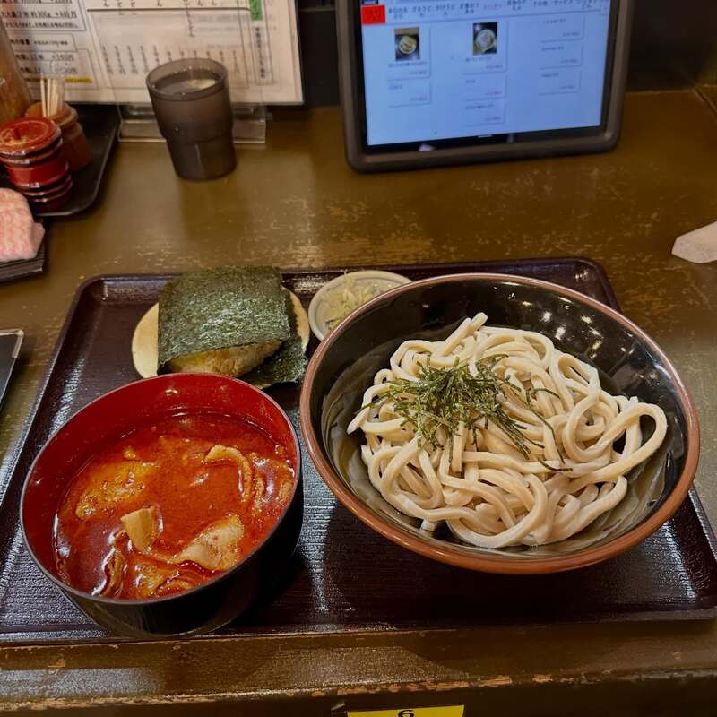 旨辛肉つけうどんノーマル麺中盛肉1.5倍あつもりに、揚げ玉ごまむすび。美味いけど肉もりの方が僕は好みかな。なのでまた来ようと思ってとうとうスタンプカードをゲットw
