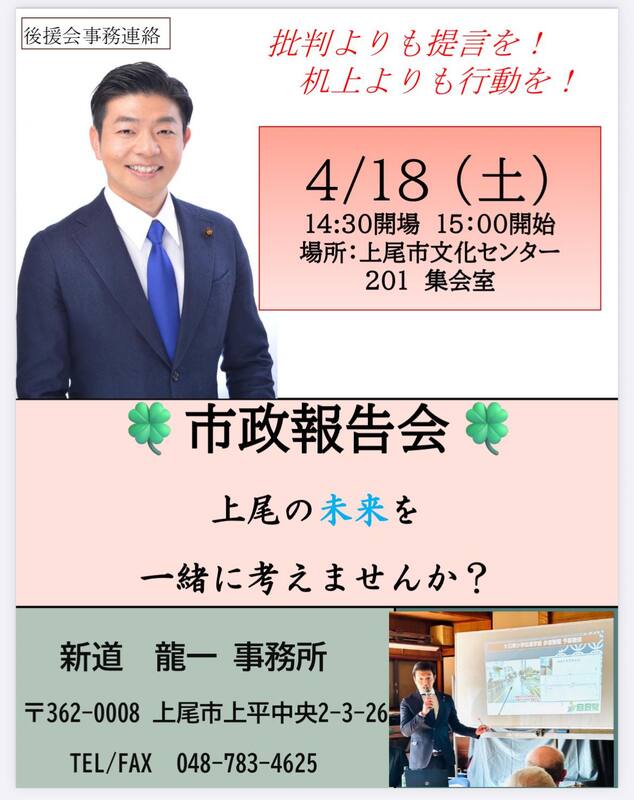 改めてご連絡いたします。 本日午後3時より上尾富士住建ホール201に於いて、市政報告会を開催いたします。 途中入室•退室も結構ですので、ご都合のつく方はご参加心よりお待ちしております。