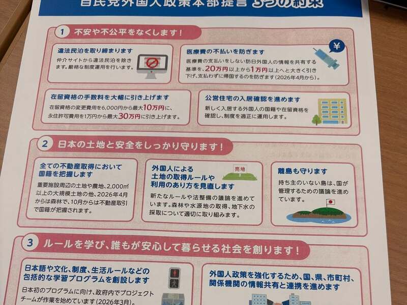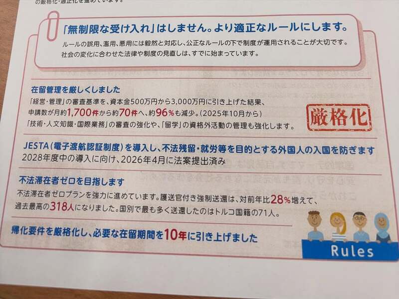 〇外国人政策本部がありました。規則の厳格化運用により、いままでルーズだった政策が大きく変わりました。その証拠に強制送還なども過去最高になっています。厳格にやることで、普通にがんばっている外国の方を守ることにもつながる、そう思って進めていきます。