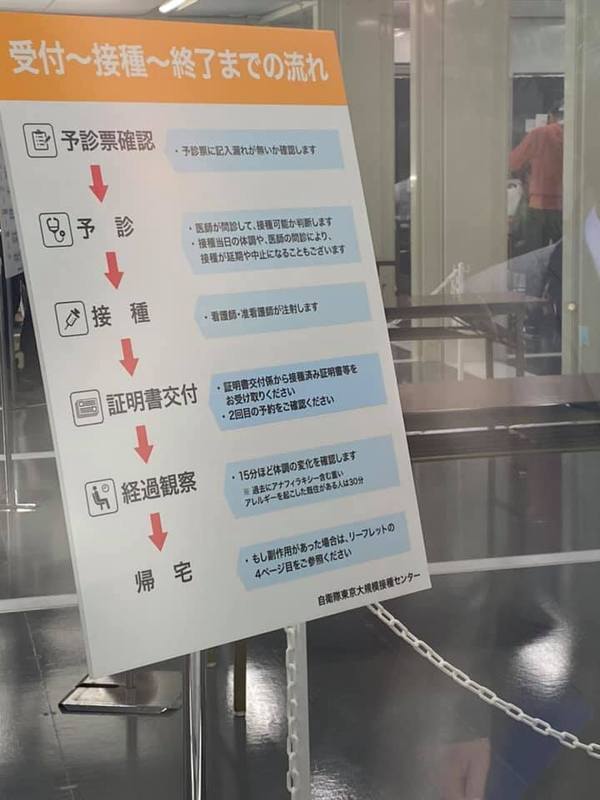 会場にくると本人確認から予診票確認に流れ、少しの待機をしてから中に入って接種をする。自分が歩くところ、行くところは全て色分けがされていて迷うことがないのです。