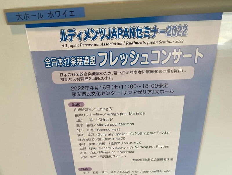〇和光市サンアゼリアで行われた、ディメンツJAPANセミナー2022 全日本打楽器連盟フレッシュコンサートに行きました。