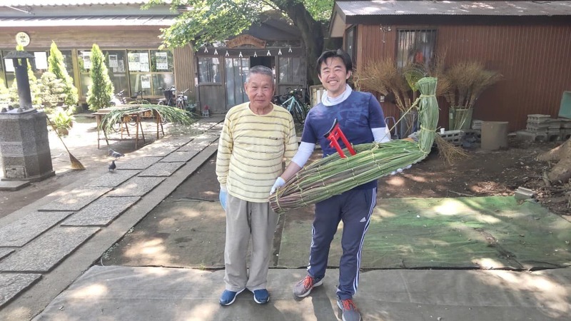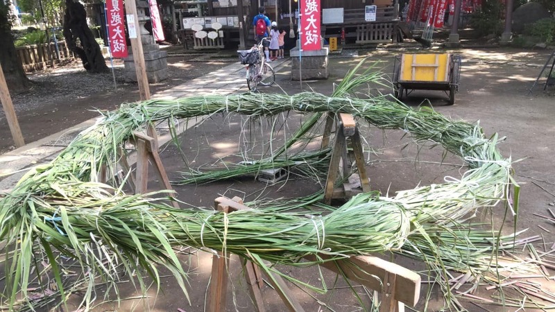 〇舘氷川神社の茅の輪くぐりにお邪魔しました。こちらの茅の輪もみな手作りで行っているのです。