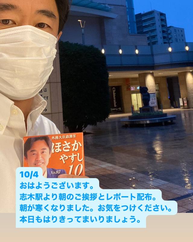 〇朝は志木駅丸井口から朝のご挨拶とレポートの配布を行いました。雨が降っており、肌寒い朝でしたね。ついに上着をだしました。