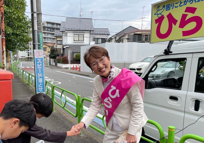 写真は未来の有権者に「あくしゅしてください!」と言われ、戸惑うひらい里美^^