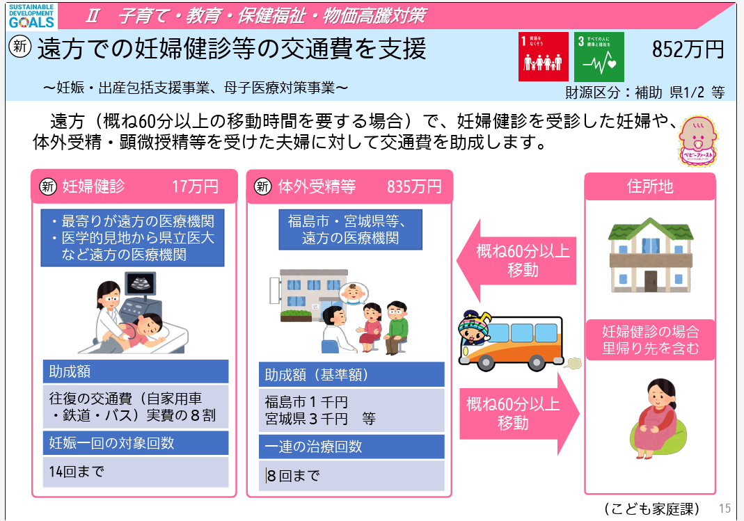 体外受精等 835万円の予算は、福島市・宮城県等、遠方の医療機関に行った場合の助成額で、福島市は1000円、宮城県は3000円。一連の治療回数は8回まで。