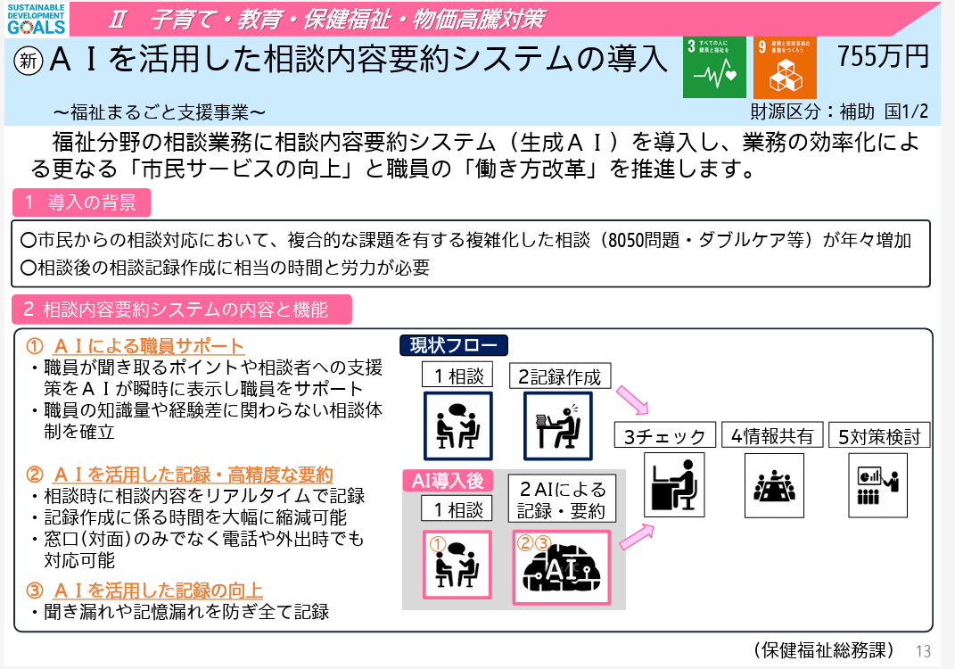 福島県郡山市では、福祉分野の相談業務に相談内容要約システム(生成AI)を導入し、業務の効率化による更なる「市民サービスの向上」と職員の「働き方改革」を推進するとのこと。