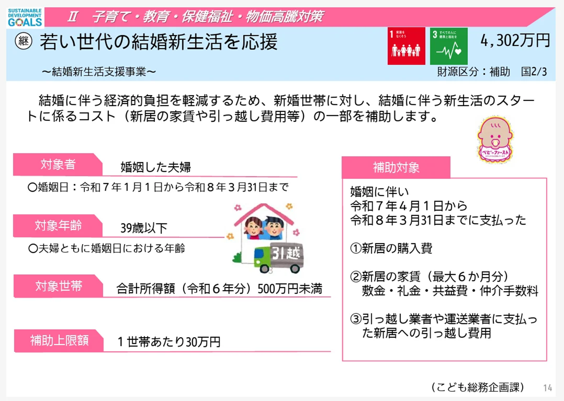 婚姻日は令和7年1月1日から令和8年3月31日までで、39歳以下、合計所得額(令和6年分)500万円未満を対象にして、1世帯当たり30万円が補助の上限です。