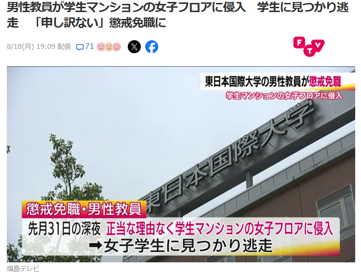 いわき市の東日本国際大学で起きた、男性教員による学生マンション女子フロアへの無断侵入事件。