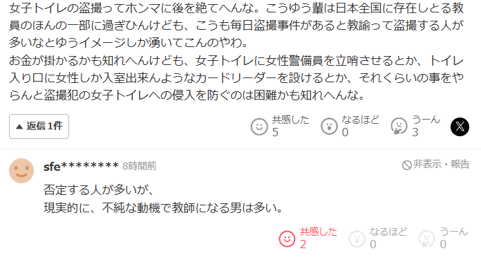 ヤフーニュースやXのコメントを分析すると、世論は「教師への不信感」と「防犯強化の要求」が支配的です。以下に傾向を整理します。