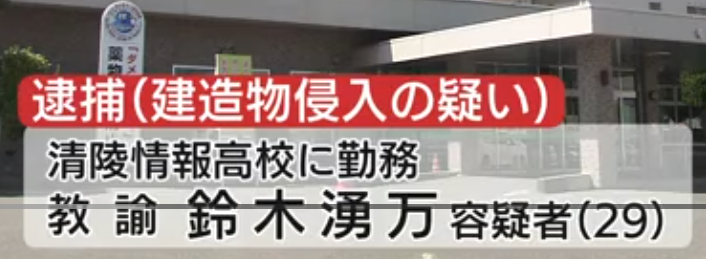 逮捕されたのは、県立清陵情報高校の教師、鈴木湧万容疑者(29)。