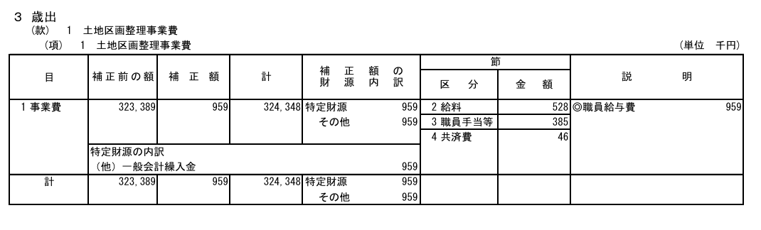 使途は 土地区画整理事業費のうち、職員給与費(給料・手当・共済費)。