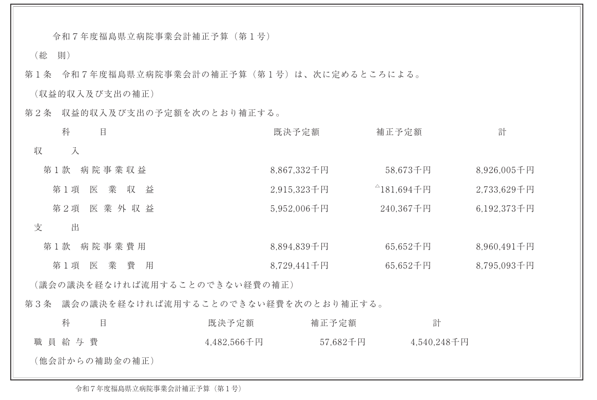 今回の福島県立病院事業会計補正予算では、次のような動きがありました。