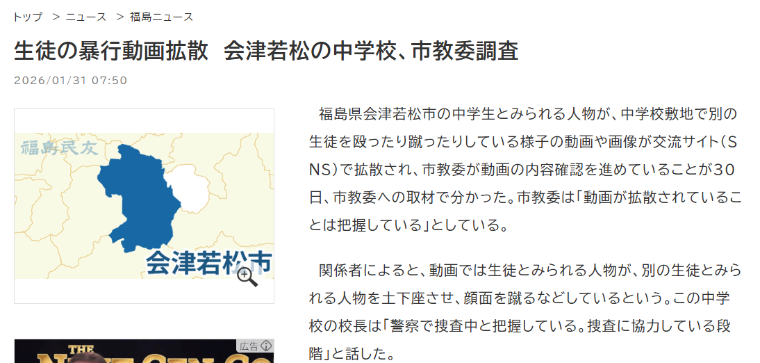 福島県会津若松市の中学校敷地内で、中学生とみられる生徒が別の生徒に対し、殴打や蹴りを加える様子を撮影した動画・画像がSNS上で拡散しています。