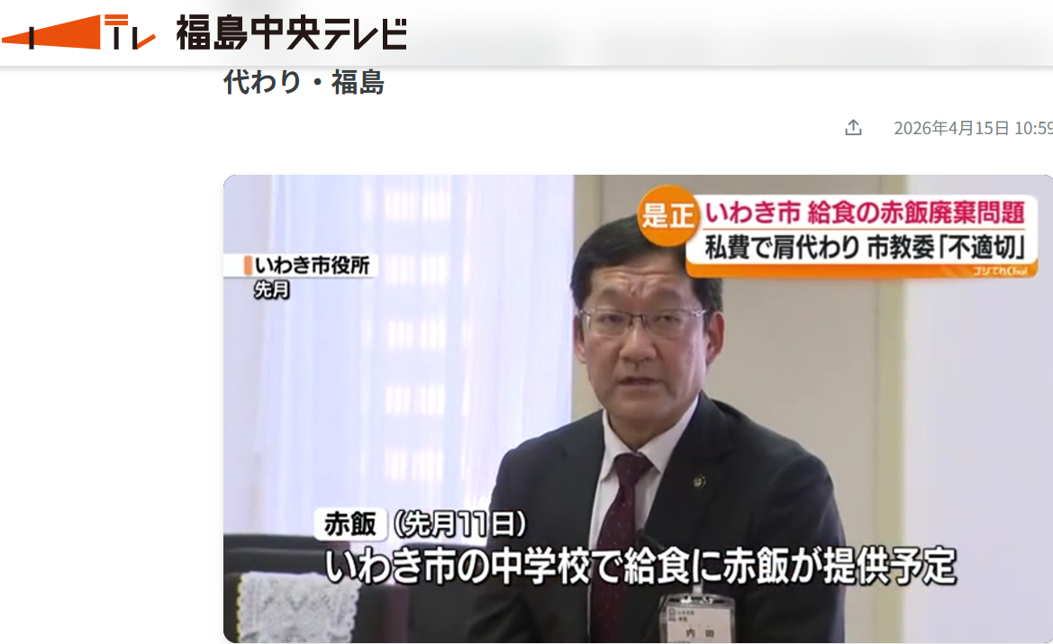 市の教育委員会によりますとこの問題について責任を感じた当時の服部樹理教育長が廃棄した「赤飯」にかかった食材購入費と炊飯代金の自費での負担を申し出たといい、3月末までに、食材を納入した福島市の事業者1社と、炊飯を担ったいわき市内の3つの事業者に対して合わせて34万1267円を支払ったということです。