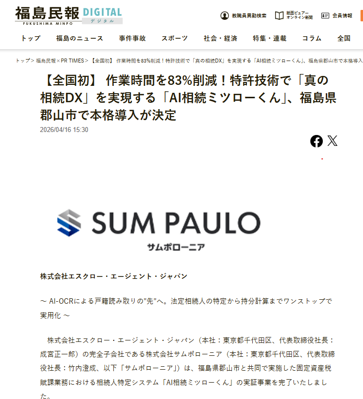 ![郡山市と株式会社サムポローニアがAI-OCRを活用した「相続人調査」の実証実験を開始![福島県郡山市役所] | 郡山市のプレスリリース](https://prcdn.freetls.fastly.net/release_image/117635/113/117635-113-71f2e1cec4507d7f07c8e06e4f5c70a2-2304x1728.jpg?width=1950&height=1350&quality=85%2C65&format=jpeg&auto=webp&fit=bounds&bg-color=fff)