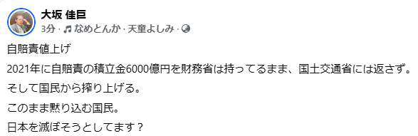 ホーム>政党・政治家>おおさか 佳巨 (オオサカ ヨシキヨ)>自賠責保険6%引き上げへ――「また国民負担か」の前に説明すべきこと