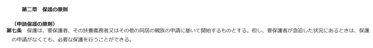 まず前提として生活保護法では、「申請に基づいて保護を開始する(申請保護の原則)」とされています(第7条)。