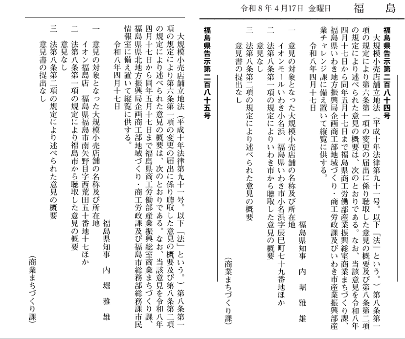 いずれも、大規模小売店舗立地法に基づく手続きです。