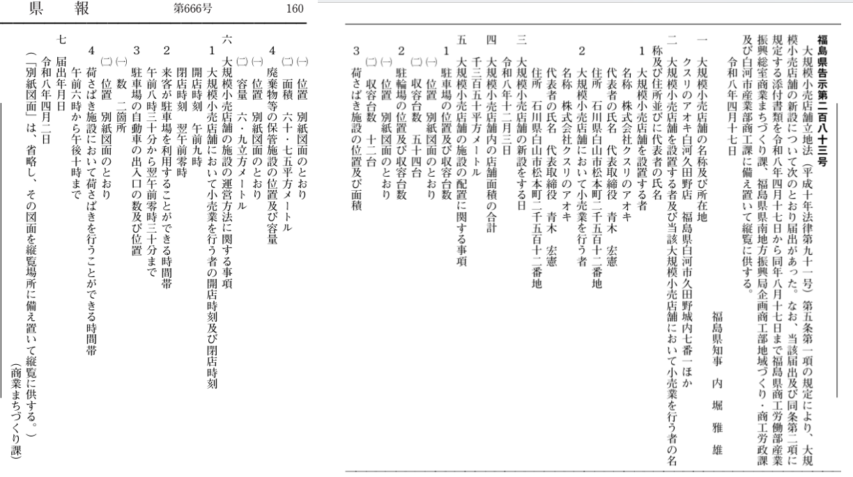 新しい大規模小売店舗の新設届出(クスリのアオキ白河久田野店)