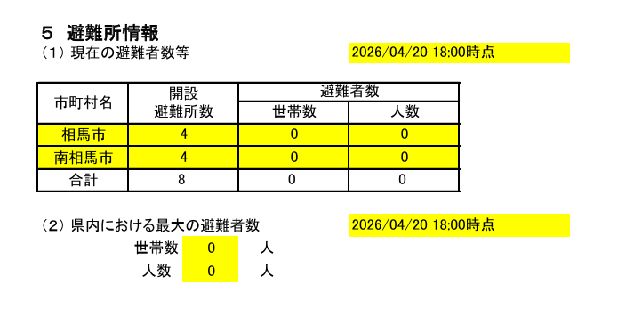 なお本日18時現在、福島県内の避難者は相馬市で四カ所、南相馬市で四カ所、合計八カ所とのこと。