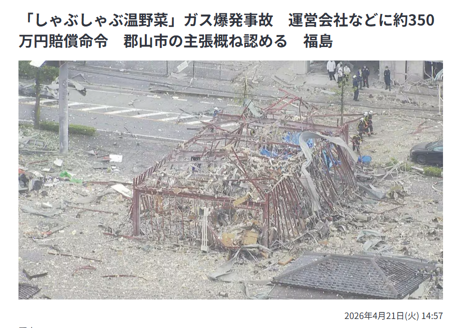 ホーム>政党・政治家>おおさか 佳巨 (オオサカ ヨシキヨ)>「しゃぶしゃぶ温野菜」爆発事故判決が示したもの― 郡山市の主張が概ね認められた ―