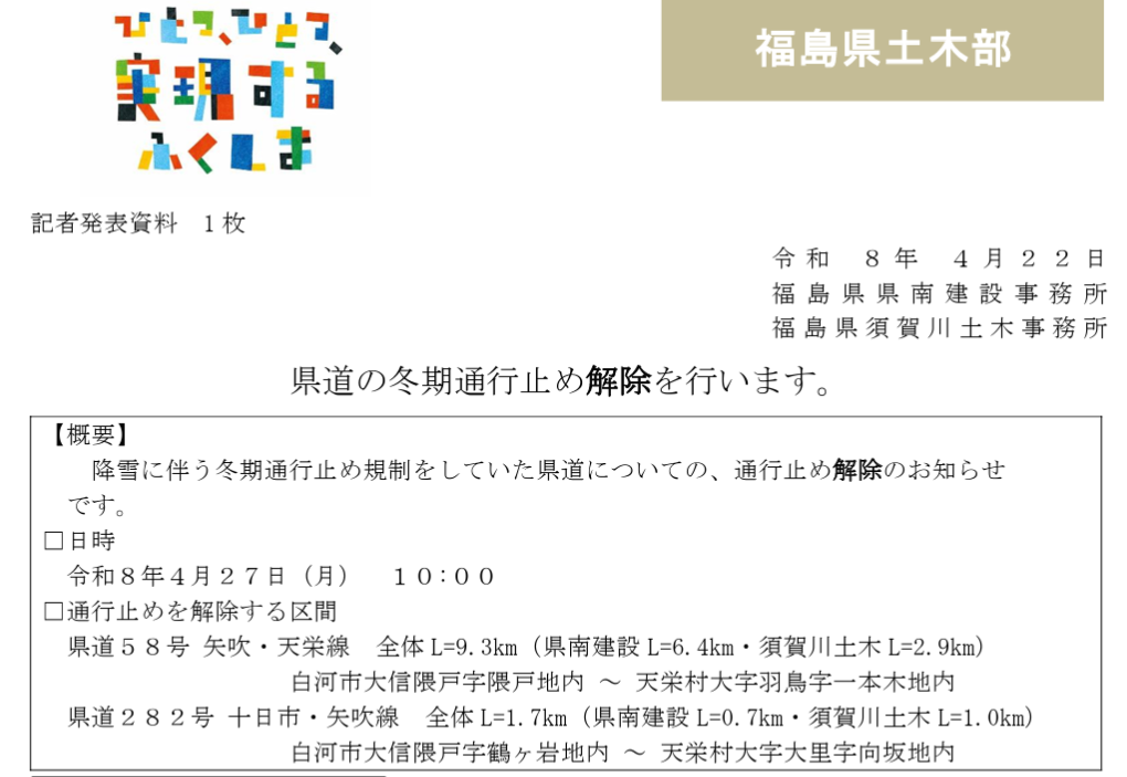福島県県南建設事務所および須賀川土木事務所の発表によると、降雪に伴い規制されていた県道の通行止めが、令和8年4月27日(月)午前10時に解除されます。