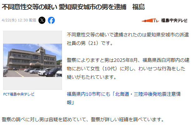 不同意性交等の疑いで逮捕されたのは愛知県安城市の派遣社員の男(21)です。 警察によりますと男は2025年8月、福島県西白河郡内の建物において女性(10代)に対し、わいせつな行為をした疑いがもたれています。