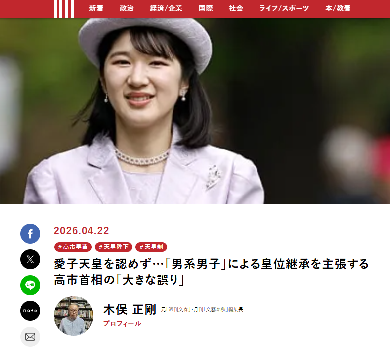 ホーム>政党・政治家>おおさか 佳巨 (オオサカ ヨシキヨ)>高市首相の「男系男子」主張に隠された大きな誤り — 愛子内親王の将来