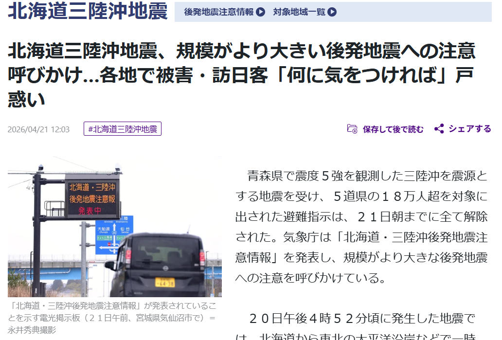 その背景にあるのが、「北海道・三陸沖後発地震注意情報」です。