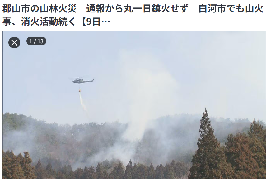 郡山市の山林火災 通報から丸一日鎮火せず 白河市でも山火事、消火活動続く【9日午前11時半現在】福島警察や消防によりますと、火事があったのは郡山市中田町で、8日午前11時半すぎ、近くに住む男性から「土手の枯れ草が燃えている」と通報がありました。