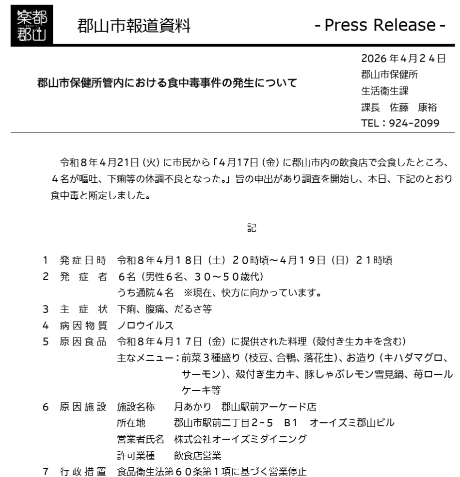 令和8年4月21日、市民からの通報を受け調査が開始され、4月24日に正式に食中毒と断定されました。