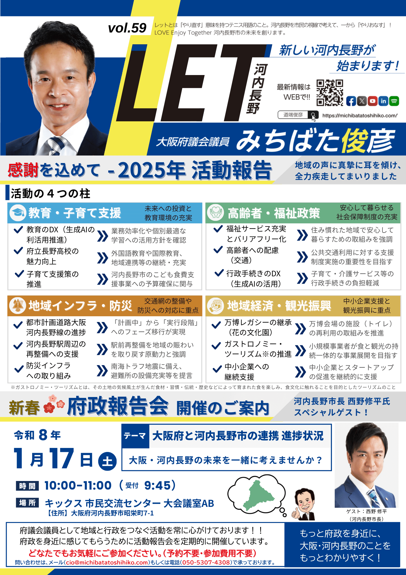 2025年の活動内容をわかりやすくご紹介しています。また、こちらを印刷して順次、街頭配布、ポスティングを始めています。皆様に府政を身近に感じていただき、 その声を府政に反映し、より良い街を創るために与えられた職責をしっかりつとめて参ります。ぜひご覧ください。
