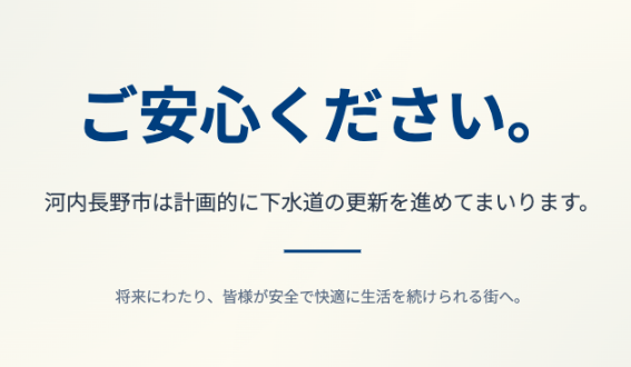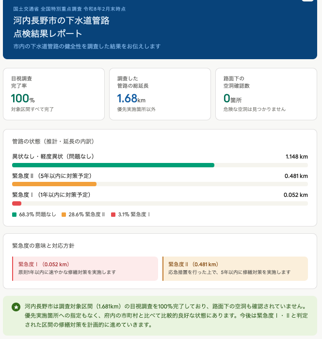まとめ 大阪府全体としては、都市規模の大きい地域を中心に今後も計画的な修繕が必要な状況にありますが、致命的な空洞はごくわずかです。その中で河内長野市はすでに調査が完全に終了しており、急を要する要対策箇所や空洞も見つかっていないため、下水道管路の安全性は比較的高い状態に保たれていると評価できます。