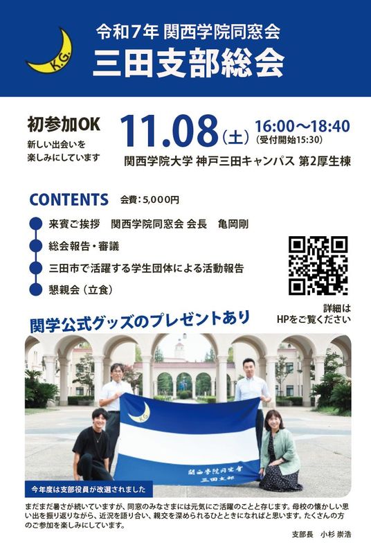 関西学院同窓会三田支部の総会が11月8日(土)に神戸三田キャンパスにて開催されます。
