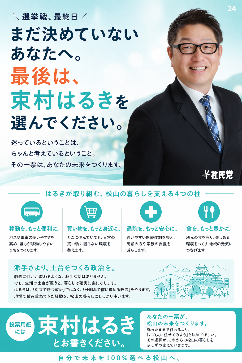 ホーム>政党・政治家>束村 はるき (ツカムラ ハルキ)>松山市議会議員選挙も、いよいよ最終日です。