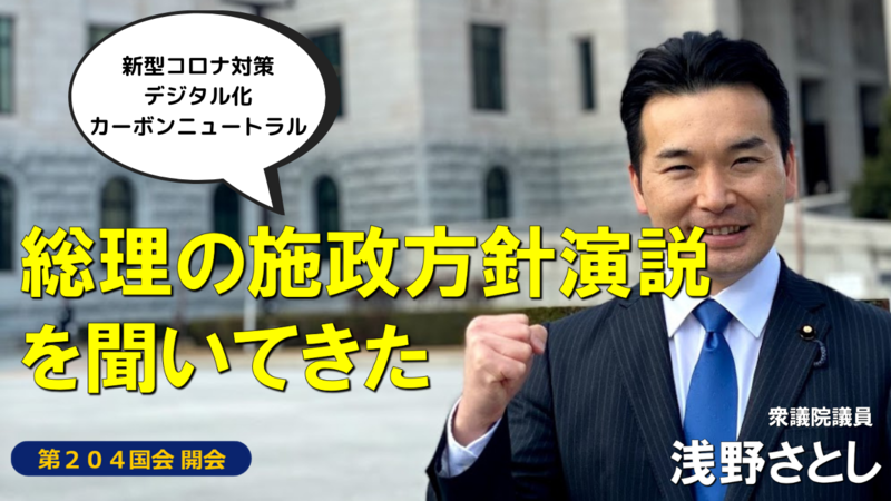 こんにちは!衆議院議員 茨城5区(日立市、高萩市、北茨城市、東海村)の浅野さとしです。 本日、第204回通常国会が召集されました。 新型コロナ対策やデジタル化推進、脱炭素化に向けた議論が始まります。 総理の施政方針演説を聞いて思ったことを動画にしましたので、ぜひご覧ください!