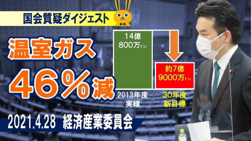 菅総理が表明した温室効果ガス46%削減目標を受けて、4月28日(水)の経済産業委員会で質疑に立ちました。