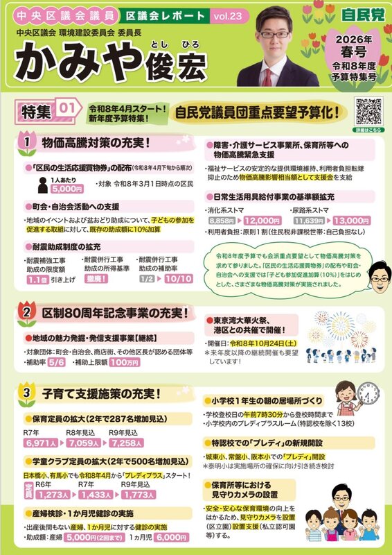 ホーム>政党・政治家>かみや 俊宏 (カミヤ トシヒロ)>▶︎区議会レポート2026年春号vol.23定例で作成している区議会レポート2026年春号を発...