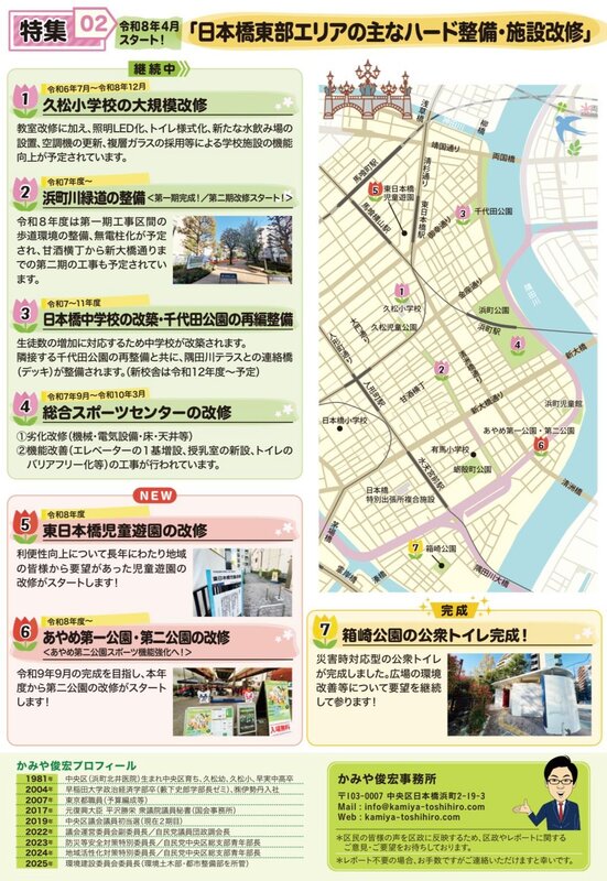 表面では物価高騰対策、区制80周年記念事業、子育て支援施策について、裏面では日本橋東部エリアの主なハード整備、施設改修について取り上げています。