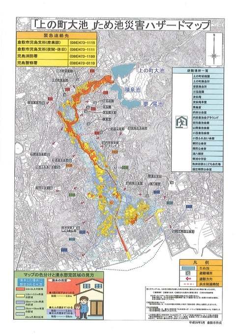 どんなマップかは添付の写真をご覧ください。👇 私の自宅が浸水エリアになる「上の町大池」のハザードマップを載せます。